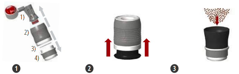 1. Rozdziel głowicę zaparzającą – podziel ją na cztery części: 1) Tłok 2) Cylinder zaparzający z tłokiem 3) Sitko 4) Uchwyt filtra.