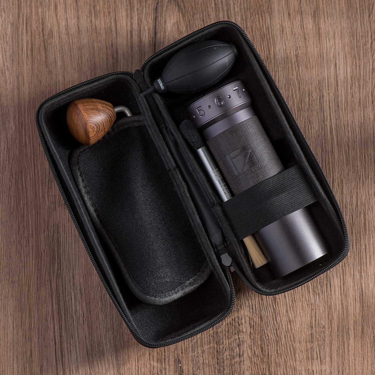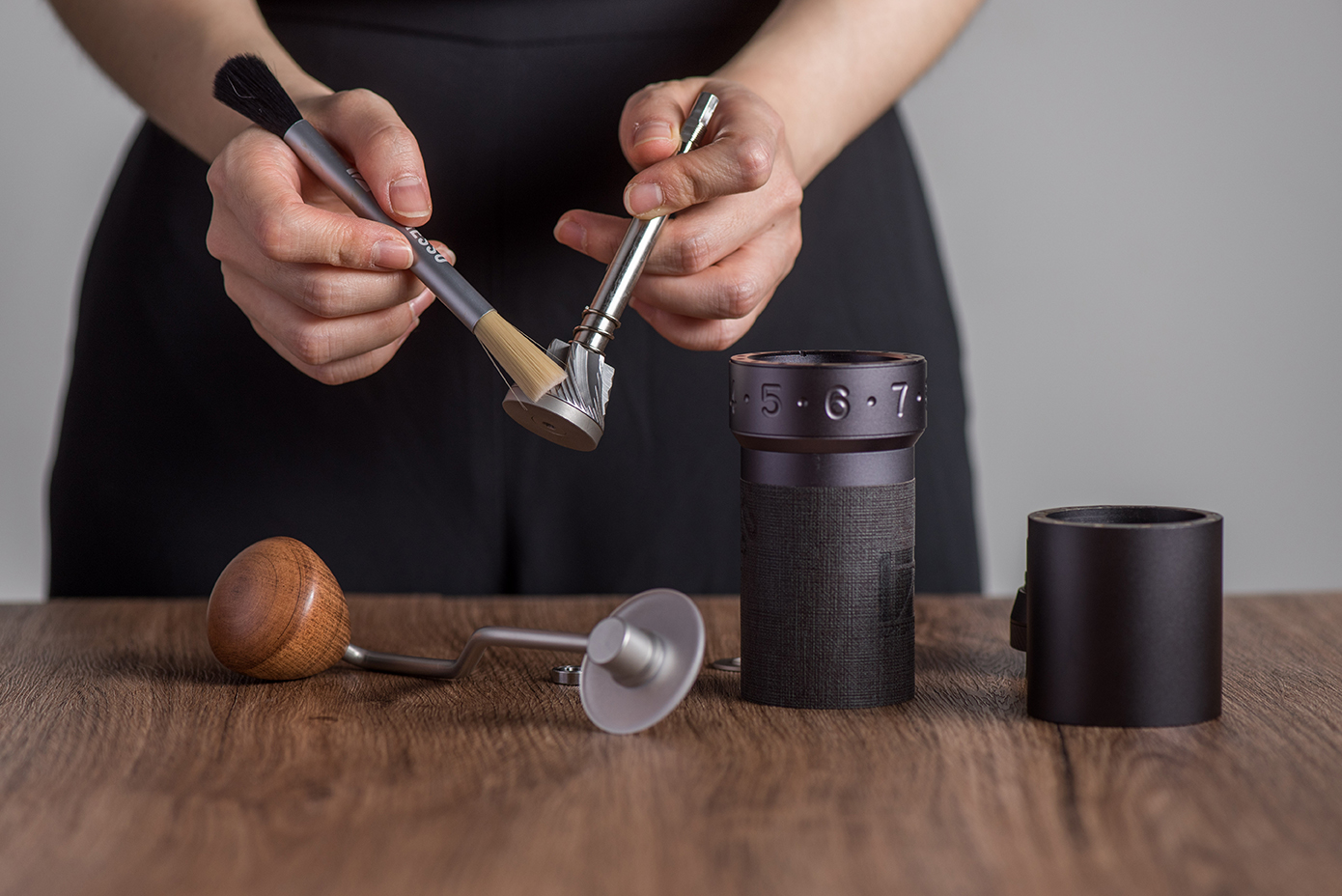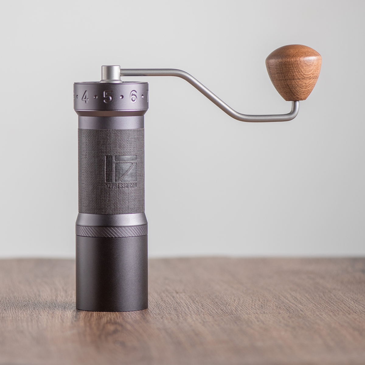 Młynek 1Zpresso K-max jest wykonany jedynie z trwałych materiałów. Korpus jest wykonany ze stopu aluminium i stali nierdzewnej. Rączka jest drewniana.