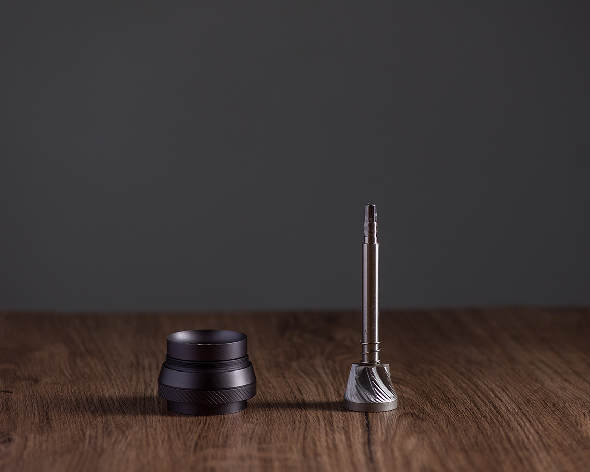 Młynek 1Zpresso K-max posiada 48 mm stożkowe żarna. Płynne mielenie zapewniają dwa łożyska. Wielkość kamieni mielących ułatwia szybsze i płynniejsze mielenie.