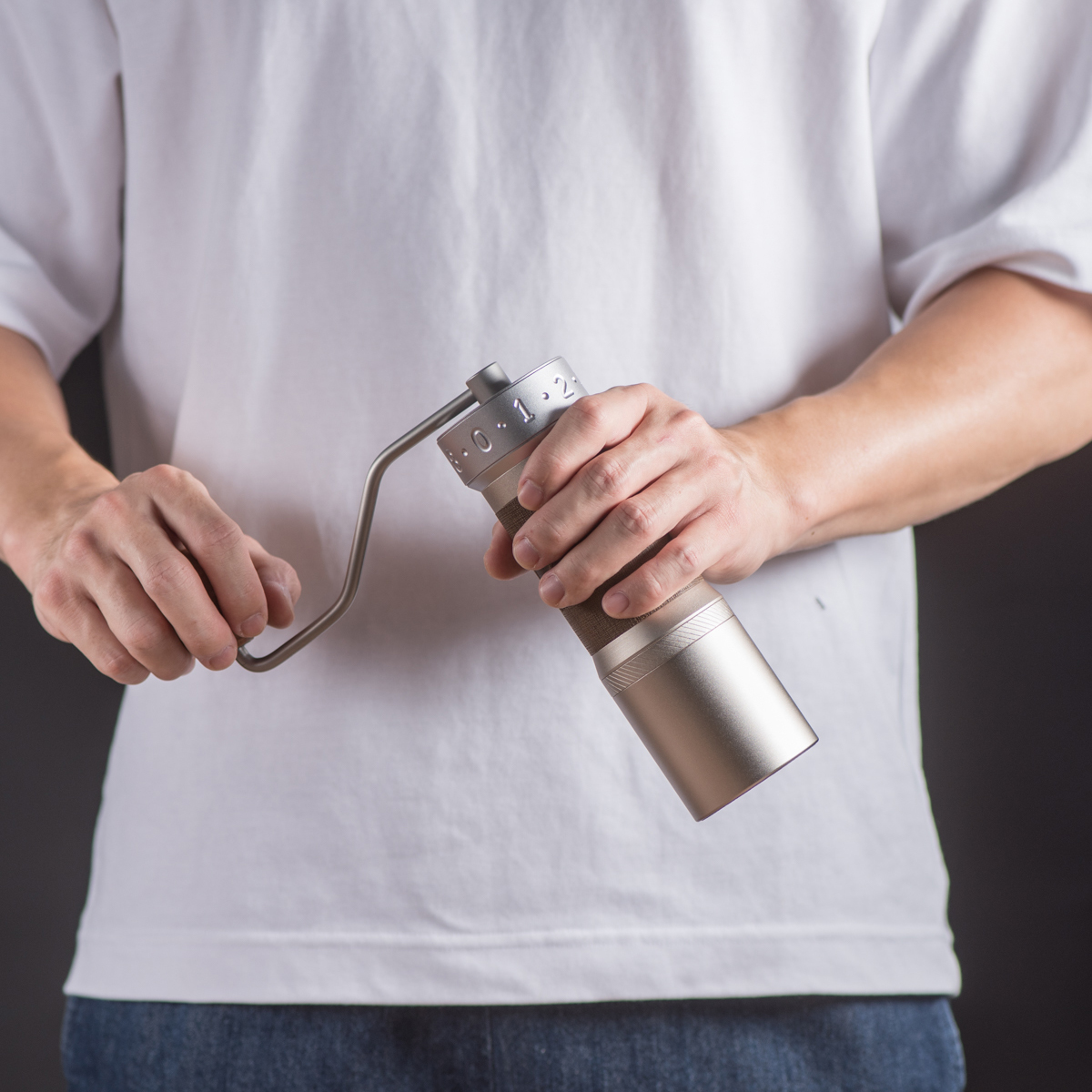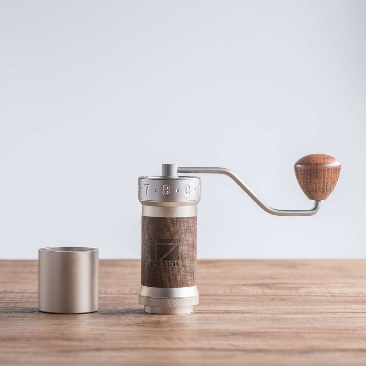 Młynek 1Zpresso K-max jest wykonany jedynie z trwałych materiałów. Korpus jest wykonany ze stopu aluminium i stali nierdzewnej. Rączka jest drewniana.