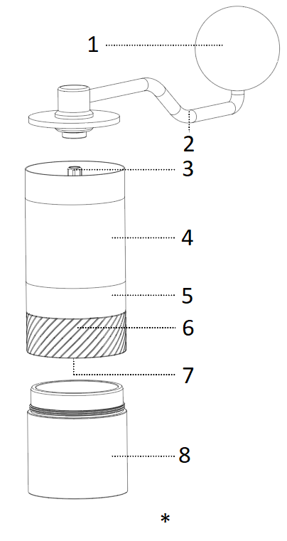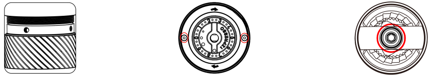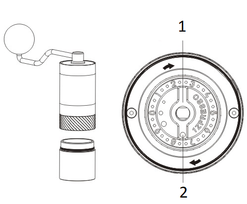 Wszystkie 1Zpresso młynki można rozmontować bez użycia narzędzi. Zamontuj i dobrze umieść korbę, zablokuj ją i poluzuj aby ją zdjąć, przekręć pokrętło regulacyjne przeciwnie do ruchu wskazówek zegara. |