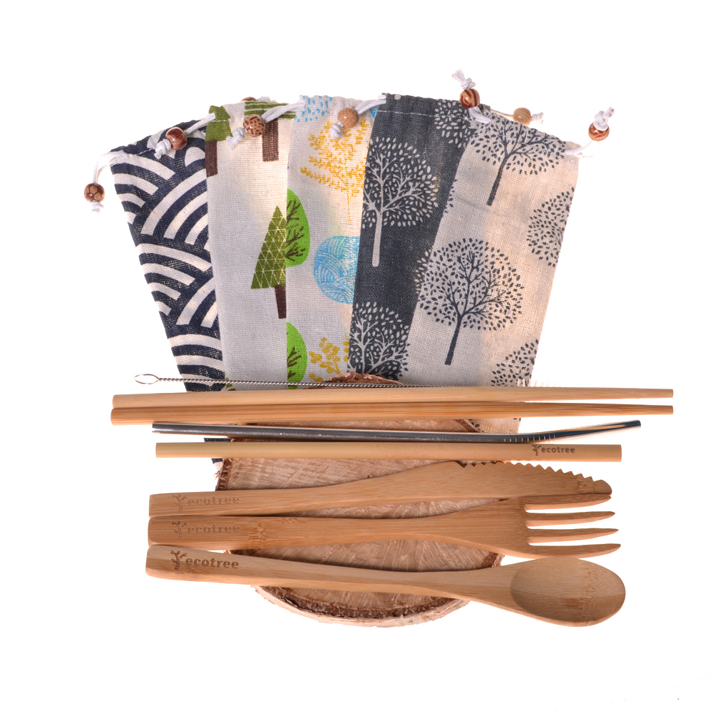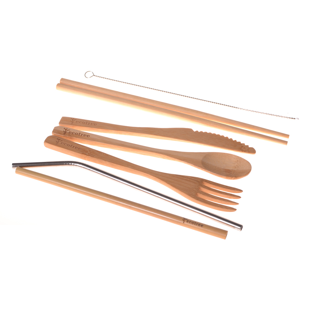 Zestaw zawiera: bambusowy nożyk, widelec, łyżeczkę, pałeczki, bambusową i nierdzewną słomkę, szczoteczkę do słomki.