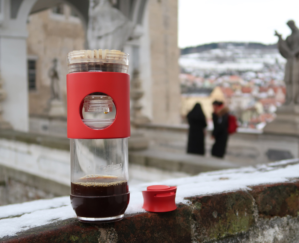 Przenośny ekspres Cafflano Go-brew przygotuje filtrowaną kawę w podróży.