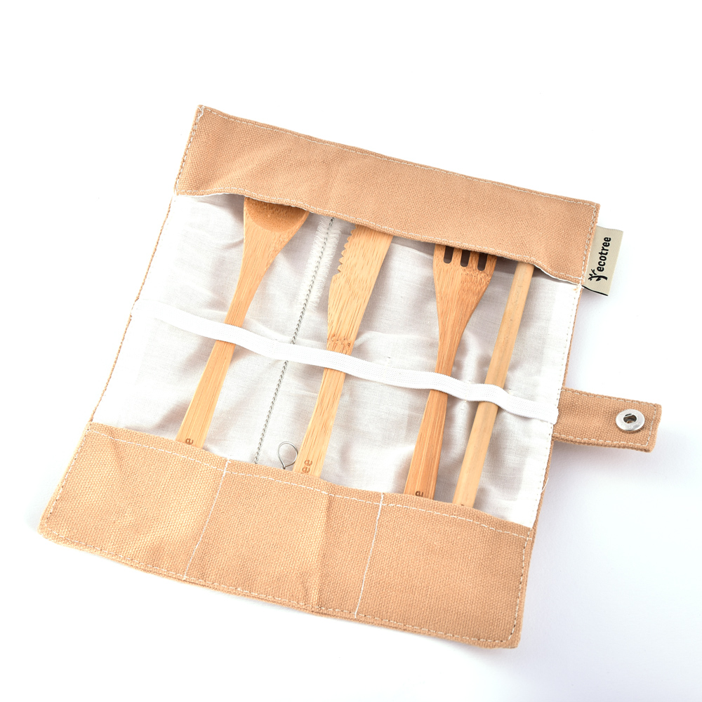Zestaw obejmuje: bambusowy nożyk, widelec, łyżeczkę, bambusową i nierdzewną słomkę, szczoteczkę do słomki.