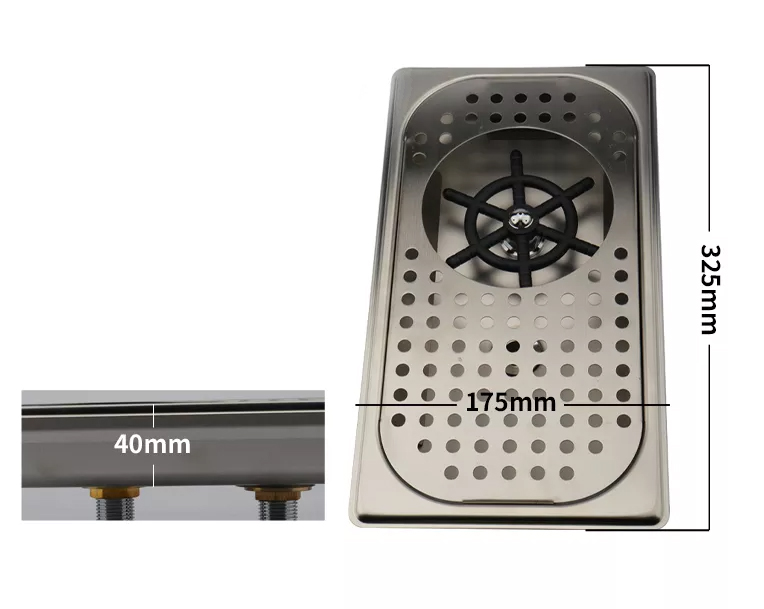 Rozmiary: 32,5 x 17,5 x 4 cm. Waga: 820g. Przyłączka rurki: 1/2". Maksymalna średnica płukanej szklanki: 11 cm.