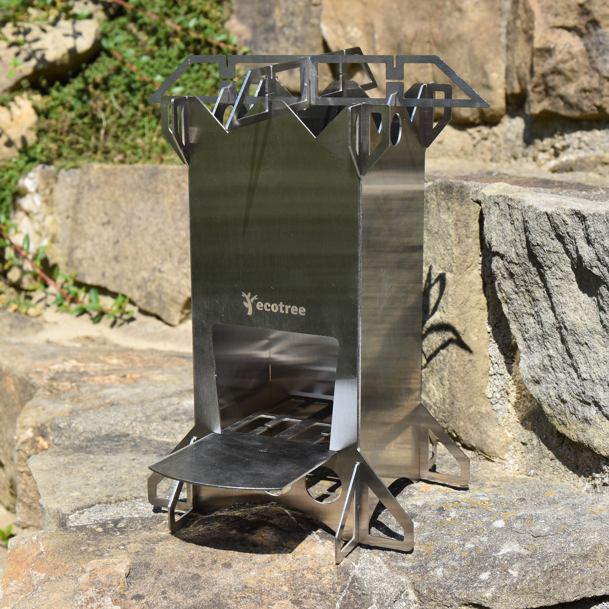 Ten składany rocket stove ecotree jest to w zasadzie zmodyfikowana kuchenka turystyczna na drewno. Zaletą wersji rocket stove jest jego kominowy kształt, który umożliwia bardziej efektywne spalanie drewna i o lepsze gotowanie, jak przy klasycznym kształcie.
