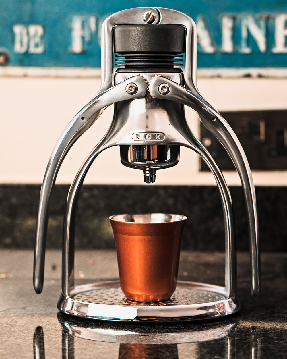 ROK Espresso GC to ręczny ekspres do kawy, który pozwala na kontrolę każdego etapu przygotowywania kawy. Dzięki zasadzie ręcznego naciskania uchwytów użytkownik ma pełną kontrolę nad ciśnieniem, co jest ważne dla uzyskania prawidłowej ekstrakcji i maksymalnego aromatu kawy.