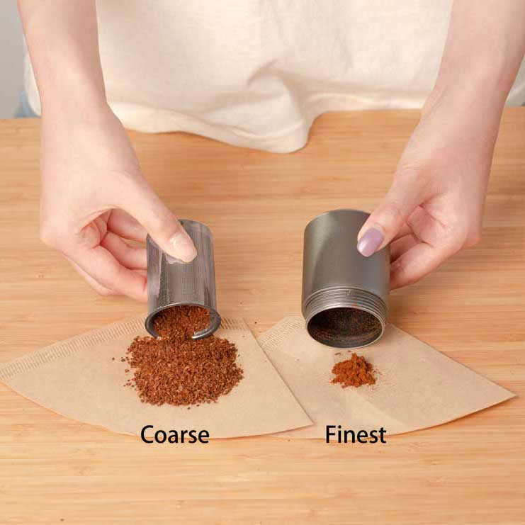 Filtr najmniejszych cząstek – zmielona kawa wpada do filtra w koszyku, wystarczy potrząść młynkiem i najmniejsze cząsteczki kawy się odfiltrują.