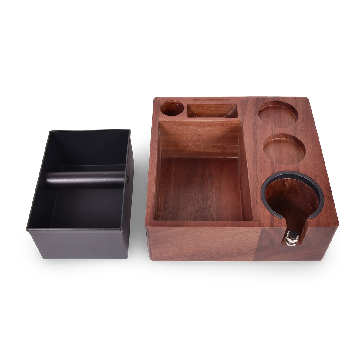 Tamping Station to praktyczny i elegancki dodatek, który idealnie uzupełni Twój narożnik barista. Zawiera uchwyt Portafilter, wycięcie Tamper, wycięcie dystrybutora i wyjmowany pojemnik na odbojniki.